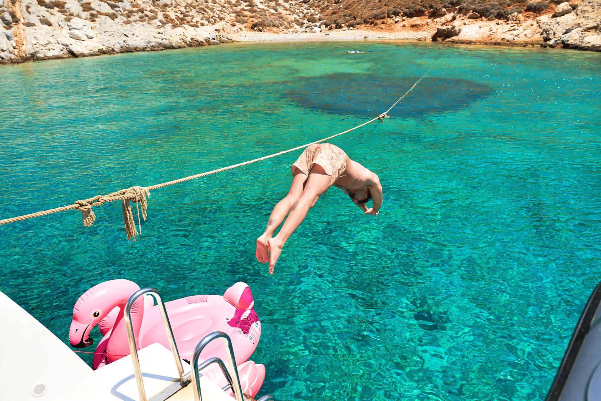 Once everything is ready, it’s time for fun! The sea becomes your playground — glide across the surface on a paddleboard, or simply drift away on our iconic pink flamingo float, basking in the warm Cretan sun.